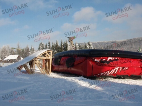 A snowboarding airbag is an inflatable cushioning system designed to provide a soft landing for snowboarders practicing aerial tricks. This safety equipment is typically large, padded, and placed strategically at the base of a jump or slope to absorb impact, reducing the chance of injury during falls. Airbags are commonly used during training sessions to help riders develop their skills with an added layer of protection.